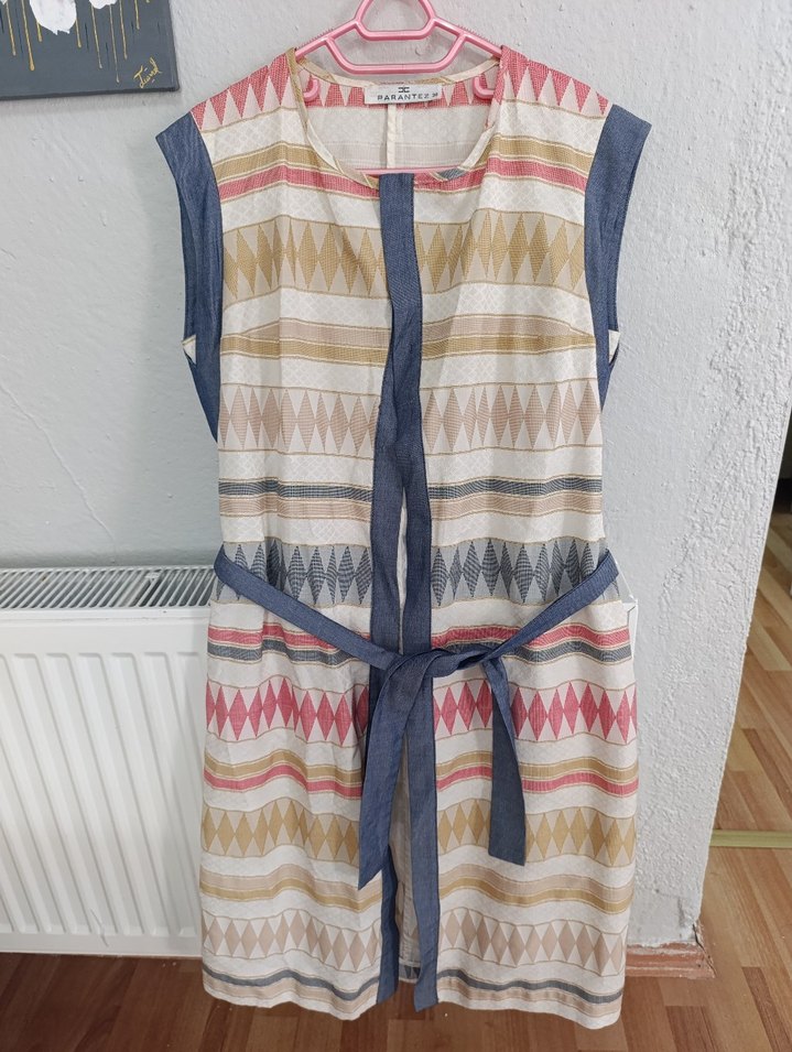 Kolsuz, bol kesim ve kemerli hamile tunik. Pastel çok renkli geometrik desenli kısa boy, günlük kullanıma uygun.