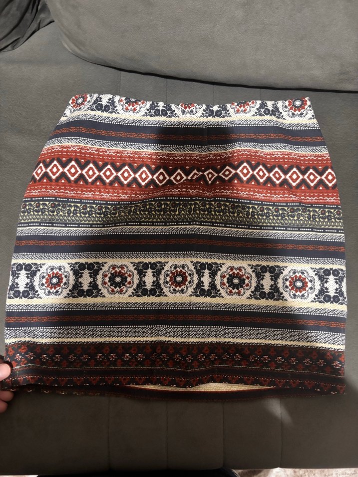 Bu dar kesim minı etek, koyu renkli çok renkli bohem desen ve örgü dokuya sahiptir, günlük kullanım için uygundur. Belınde daraltma mevcut 38 den 36 bedene gore pens atıldı