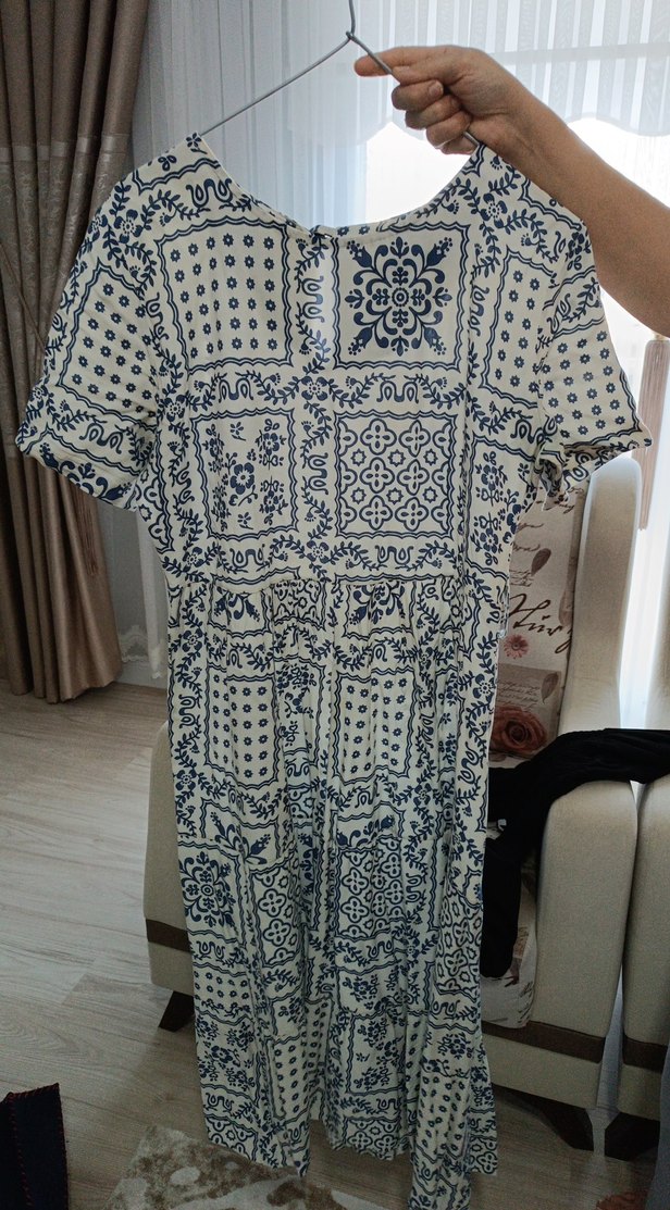 Bohem tarzda, , kısa kollu, yuvarlak yakalı, bol kesim mavi beyaz desenli midi uzunlukta hamile elbise.