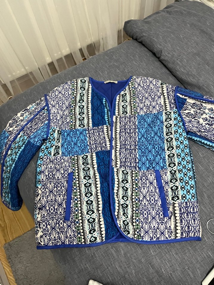 Uzun kollu, bohem tarzda, mavi desenli triko kumaştan, rahat kesimli midi uzunlukta kadın ceket. Önünde cepler bulunur.