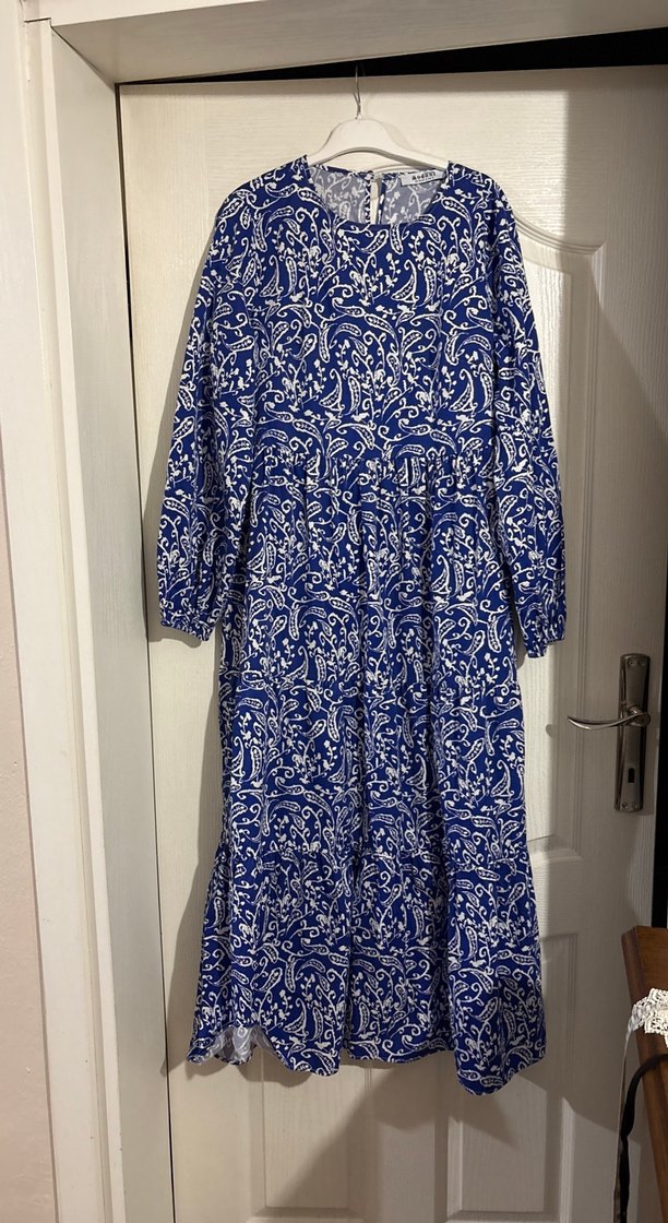 Koyu mavi uzun elbise, bol kesim ve drapeli tasarıma sahip. Uzun kollu, bohem desenli ve yuvarlak yakalı, yumuşak sentetik kumaştan yapılmıştır. 132 cm