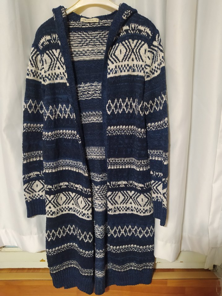 Desenli ve çentikli yakalı, uzun kollu, mavi triko hırka. Bol kesim ve midi boyda, rahat ve bohem tarzda bir parça.