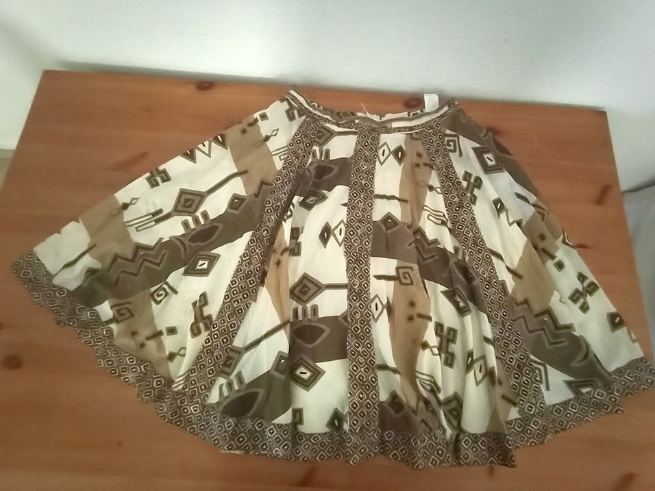 Bohem desenli, kahverengi ve gri tonlarda, drapeli, rahat kesimli midi hamile eteği. Günlük kullanıma uygundur.