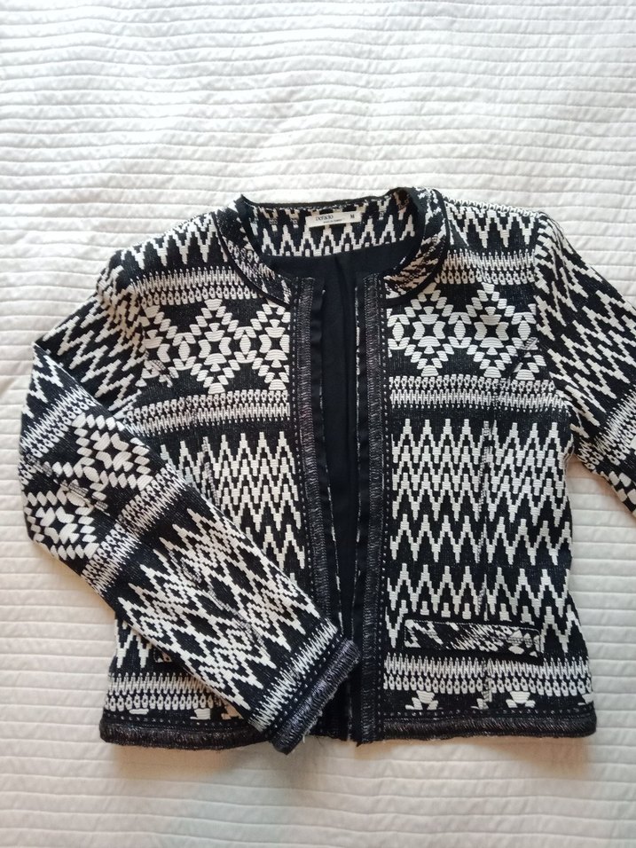 Uzun kollu, yakalı ve bohem desenli örgü midi hırka. Rahat kesim ve günlük kullanım için uygun sıcak örgü kumaş.