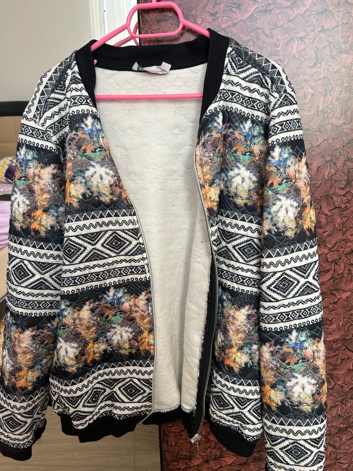 Bohem tarzda, rahat kesim, crew yaka ve uzun kollu kadın ceket. Yumuşak sentetik kumaştan, gri ve çok renkli desenli, günlük kullanım için uygundur.