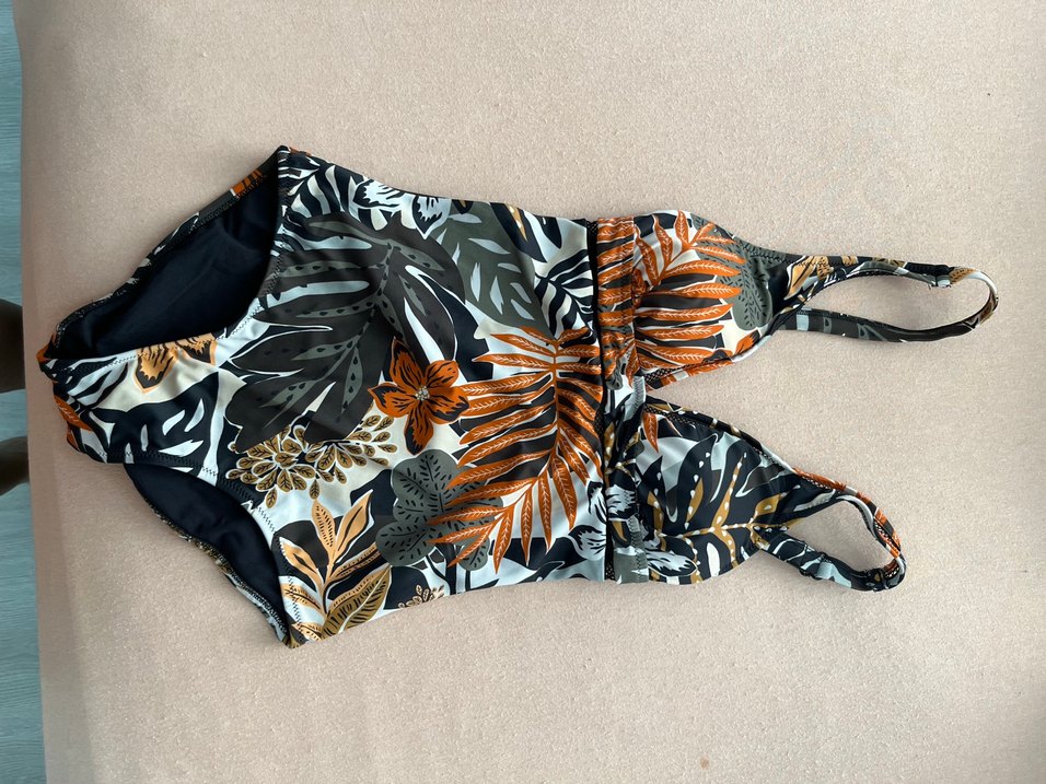 Bu kadın mayo, bohem desenli, sıkı kesim, askılı ve drapeli tasarımıyla dış mekan kullanımı için uygundur.