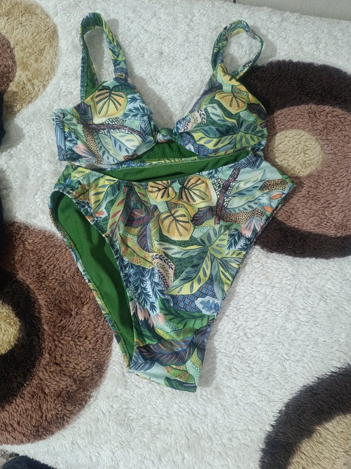 Çok renkli bohem tarzda, bağcıklı askılı ve dantel detaylı mayo. Yaprak desenli ve normal kesim, plaj için uygun.