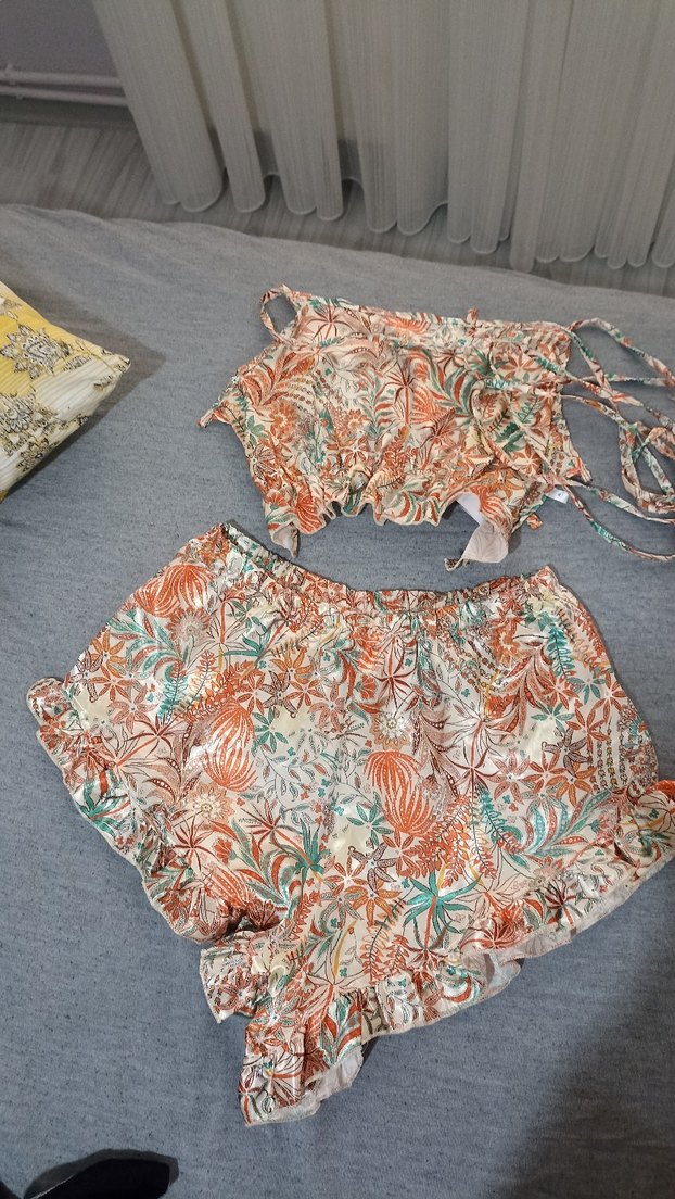 Bohem tarzda, bol kesim, desenli ve volan detaylı, askılı kısa plaj takımı, canlı gri ve çok renkli.