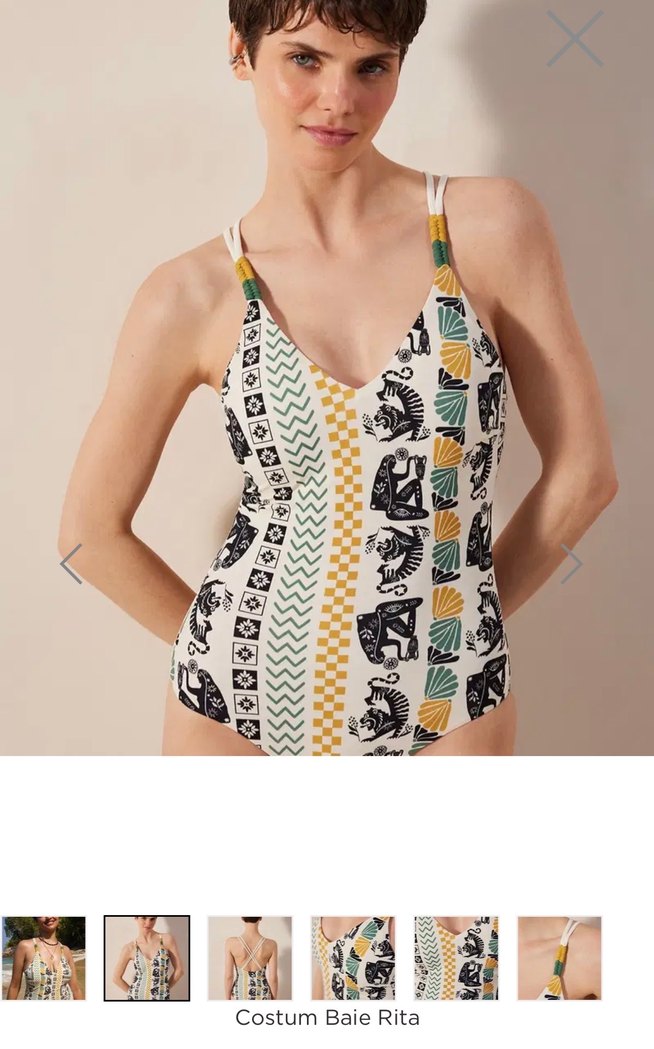 Dar kesim, çok renkli bohem desenli kadın mayo, ince askılarla. Kısa boyu ve rahat stiliyle plajda şıklık sağlar.
