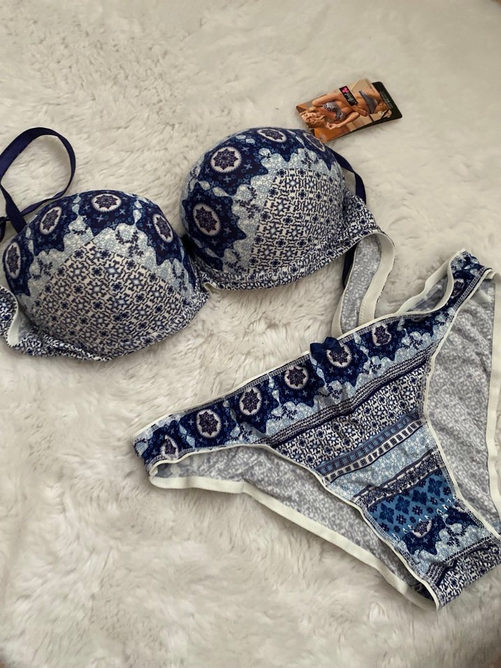 Mavi ve gri tonlarda desenli, bohem tarzı kısa sütyen ve mini külot takımı. Ayarlanabilir askılıdır.