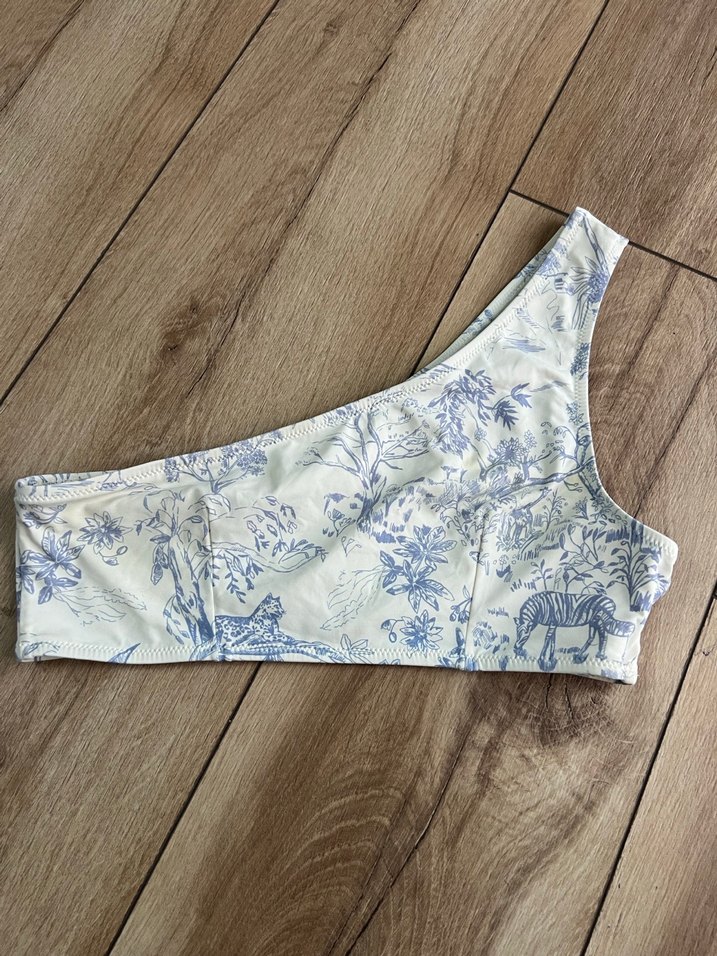 Beyaz renkte mavi desenli , tek omuz tasarımlı, pastel bohem desenli vintage tarzda kısa kesim sütyen.