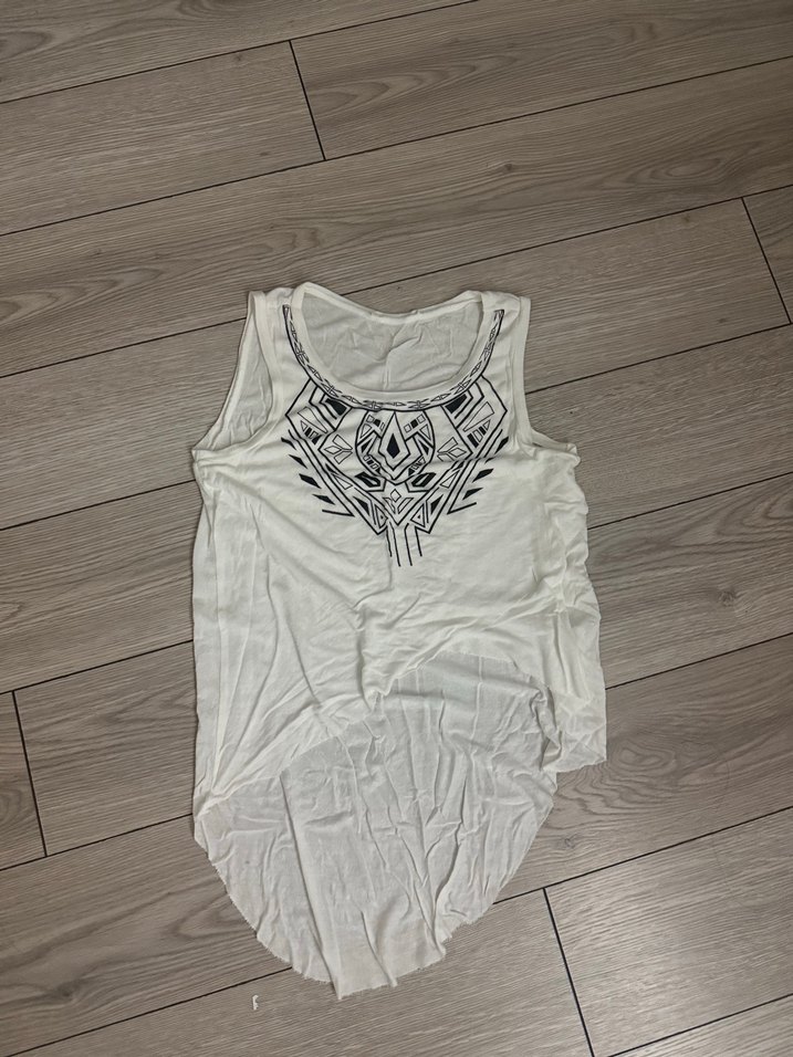 Keten kumaştan, kolsuz ve tekne yaka, gri geometrik baskılı bol kesim kısa üst. Rahat ve bohem tarz için uygun. Önü kısa arkası uzun