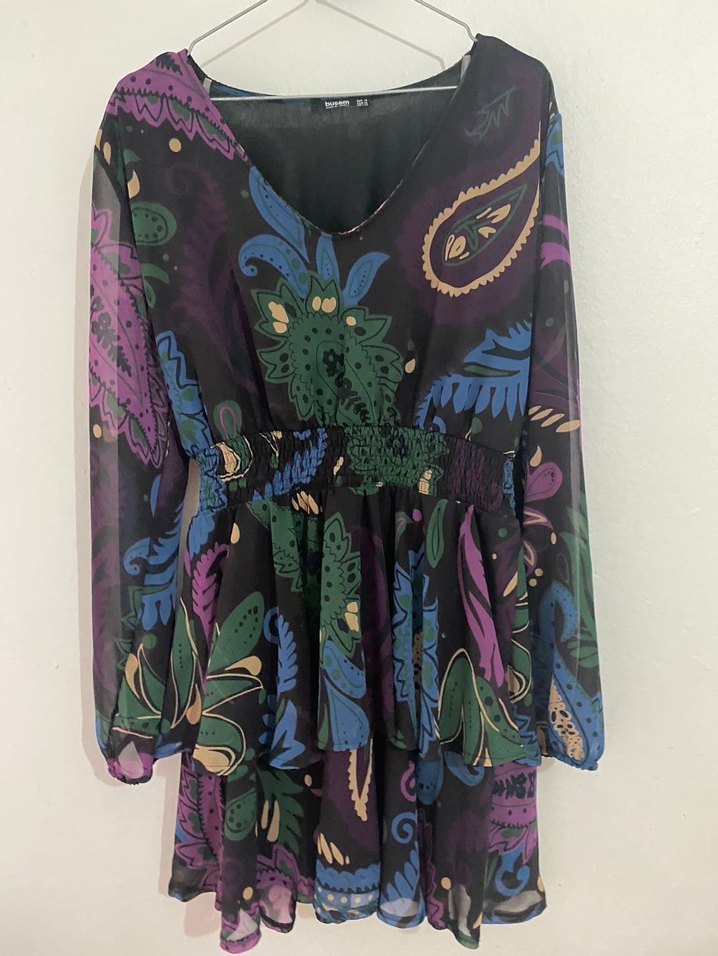 Bu bol kesim mini elbise, koyu renkli çok renkli bohem desenlere sahip, uzun kollu ve drapeli tasarımlıdır. V yaka ve elastik bel detayına sahiptir.