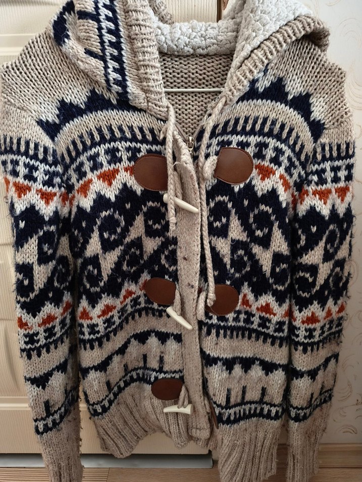 Bohem tarzı, örgü hırka, desenli ve uzun kollu. Rahat kesimiyle günlük kullanıma uygundur. Kahverengi ve gri tonlarında.Kapşonlu hırka