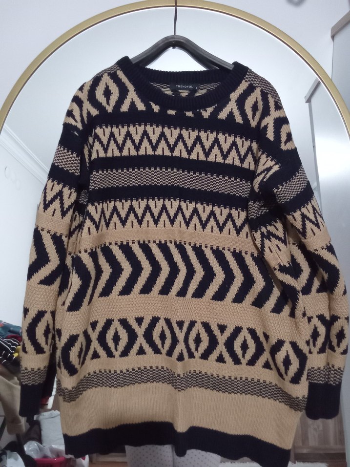 Bu kahverengi örgü kazak, bol kesim, uzun kollu ve yuvarlak yakalıdır. Geometrik desenlerle bohem tarzı sunar, günlük kullanım için uygundur.