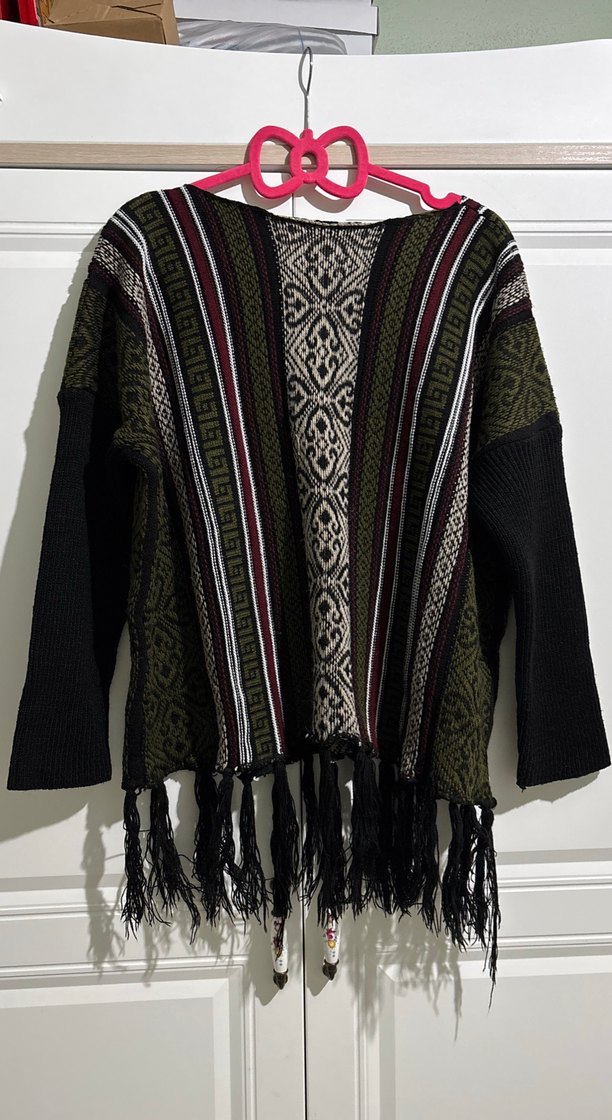 Bu kadın kazağı, uzun kollu ve yuvarlak yakalı, koyu çok renkli örme desenlere sahiptir. Salaş kesim ve normal boyda olup, püsküllü etek ucu detayıyla bohem tarzı yansıtır.