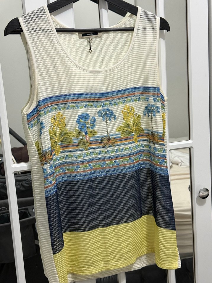 Kolsuz, örme dokulu, çok renkli çiçek desenli, bol kesim ve askısız yuvarlak yaka bohem tarzda bluz. İpekyol marka az kullanıldı M beden de kullanabilir.