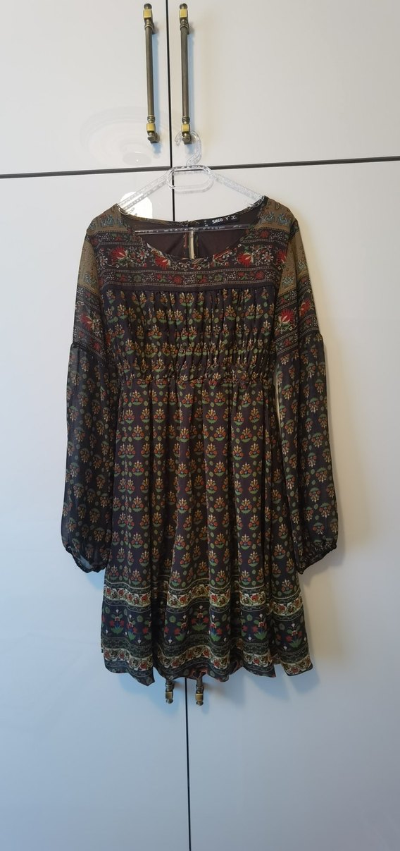 Bohem tarzda, çok renkli desenli, uzun kollu ve bol kesim tunik, romantik akşamlar için uygundur. 40 beden kolları tül astarlı.