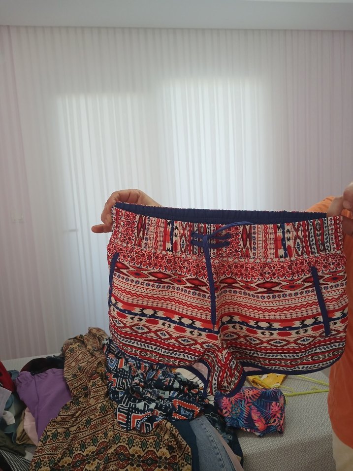 Renkli, bohem tarzda, bol kesim, kemerli belde desenli mini şort.