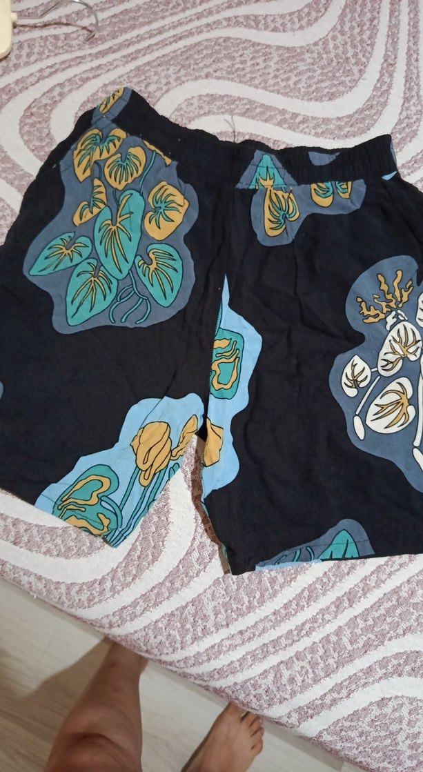 Salaş kesim, koyu renkli çok renkli bohem desenli hamile mini şort. Yumuşak sentetik kumaştan, günlük sokak stili için drapeli tasarım.