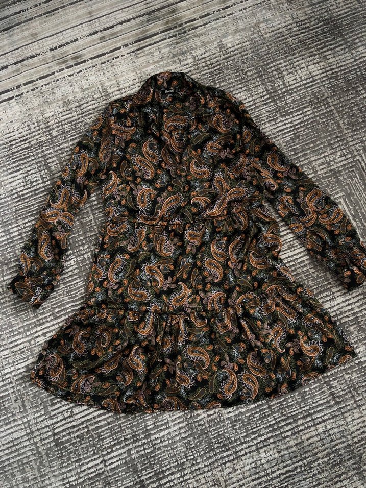 Bohem tarzda, koyu renkli desenli elbise. yaka, düğmeli ve uzun kollu. Rahat kesimli, yumuşak sentetik kumaştan üretilmiştir.