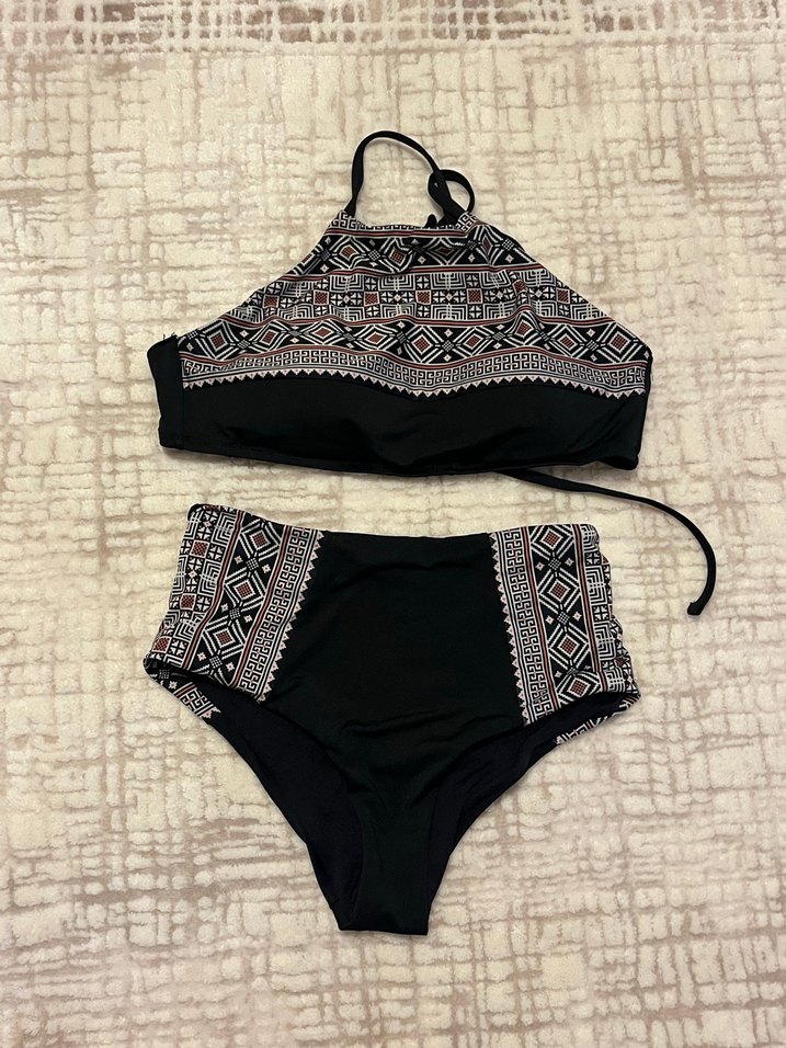 desenli ve siyah renkli, bohem tarzda, askılı üst ve yüksek bel mini alt parçalı bikini. penti marka S-34 beden