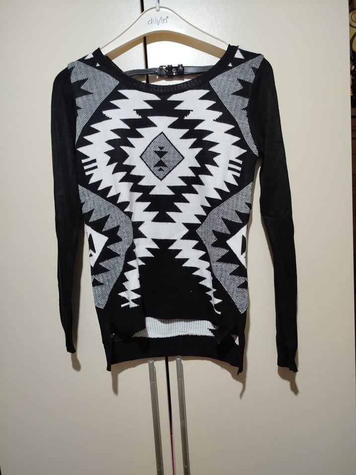 Siyah renkli, bohem desenli, uzun kollu triko kazak. Salaş kesim, normal midi boyda, günlük ve sokak stiline uygun.