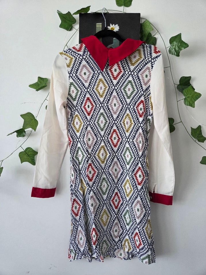 Bohem tarzda, yakalı ve uzun kollu, kırmızı manşet detaylı, çok renkli desenli triko midi tunik. Günlük kullanıma uygundur. kusuru yoktur