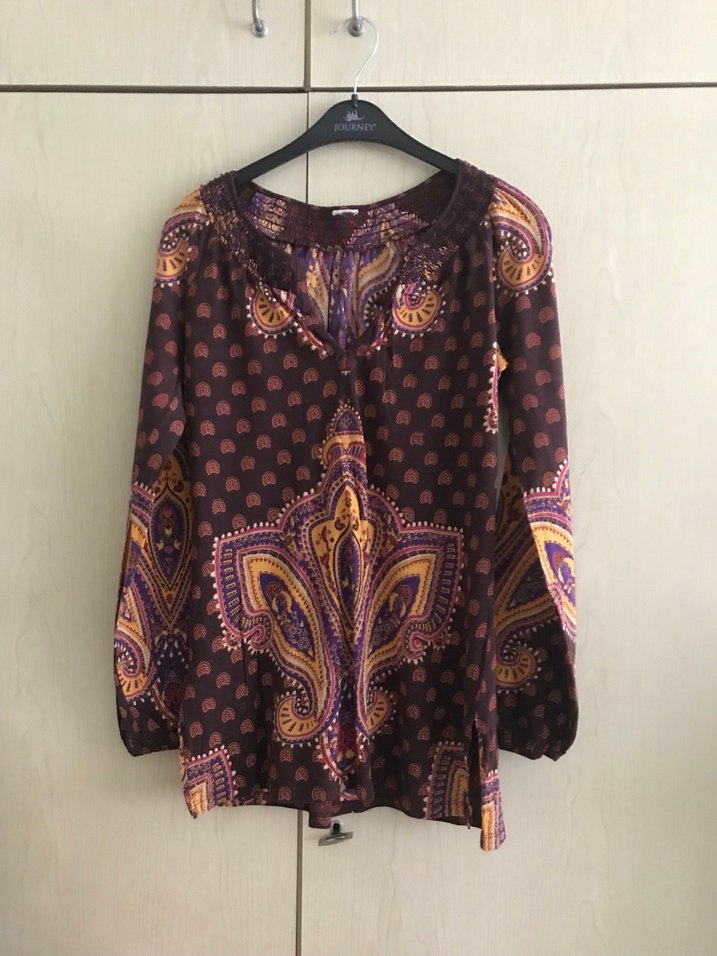 Uzun kollu, V yakalı, düğmeli ön kısmı olan bol kesim bluz. Yumuşak tekstil kumaştan, koyu mor bohem batik desenli, günlük kullanım için uygundur. Amerika’dan alındı. Ölçüsü göğüs 50 cm boy 60 cm