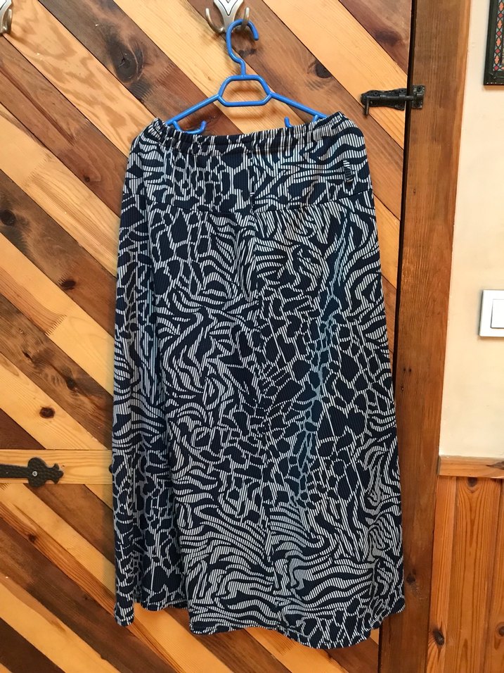 Gri desenli bu uzun etek, bol kesim ve drapeli tasarıma sahip, yumuşak sentetik kumaştan üretilmiştir. Sokak ve bohem tarzlara uygundur.