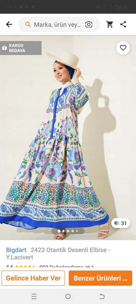 Yüksek yakalı, uzun kollu, bol kesim, sentetik kumaştan, drapeli, çok renkli desenli uzun elbisedir. Günlük kullanım için uygundur. tane fiyatıdır