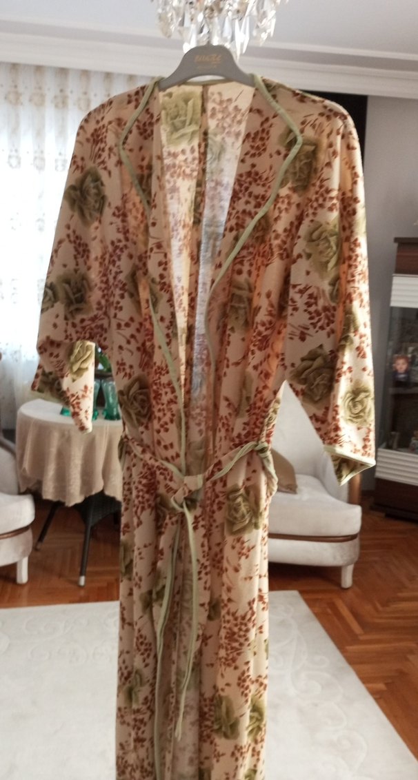 Bol kesim, uzun kollu, vintage bohem desenli uzun kadın sabahlık. Açık bej tonlarında, bağlamalı tasarım içerir. eni 60 cm. boyu122cm. kendim diktim.