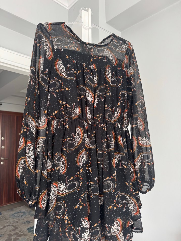 Bohem tarzda, bol kesim ve katlı . Uzun kollu, yuvarlak yaka ve fırfır detaylı, koyu renkli çok renkli desene sahip sentetik kumaştan.