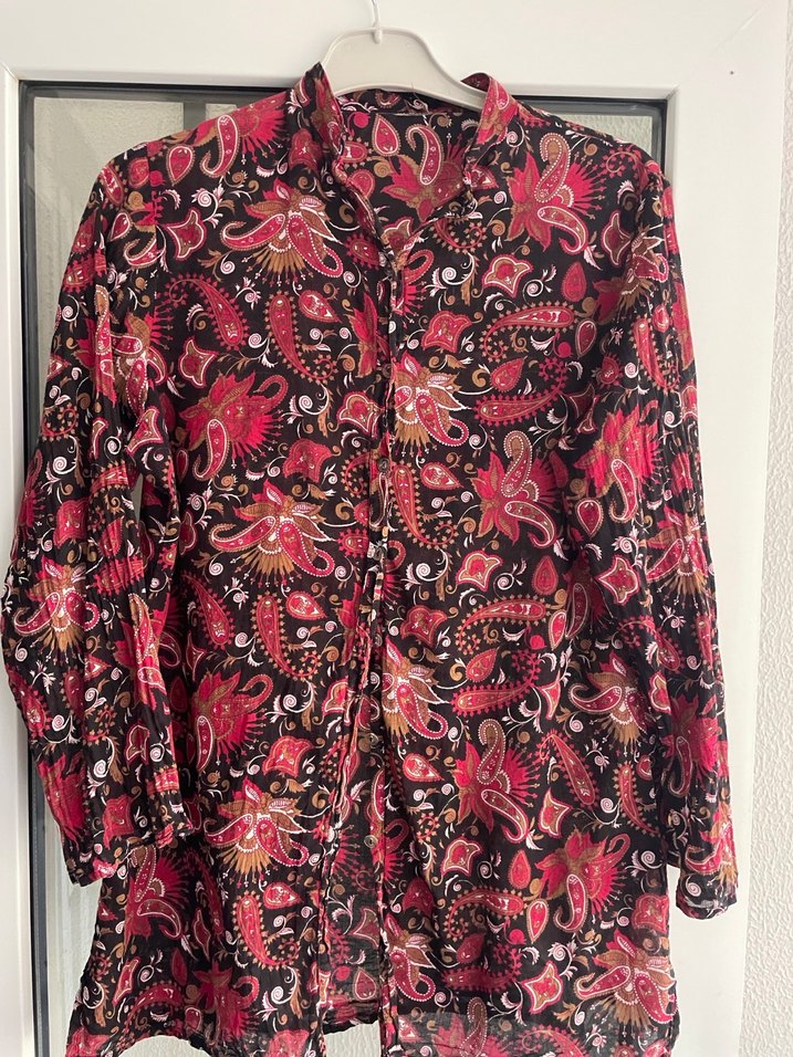 Bohem tarzda, çok renkli desenli tekstil kumaş, yüksek yaka ve düğmeli ön kısmı olan uzun kollu, bol kesim kadın gömleği. Günlük kullanım için uygundur.