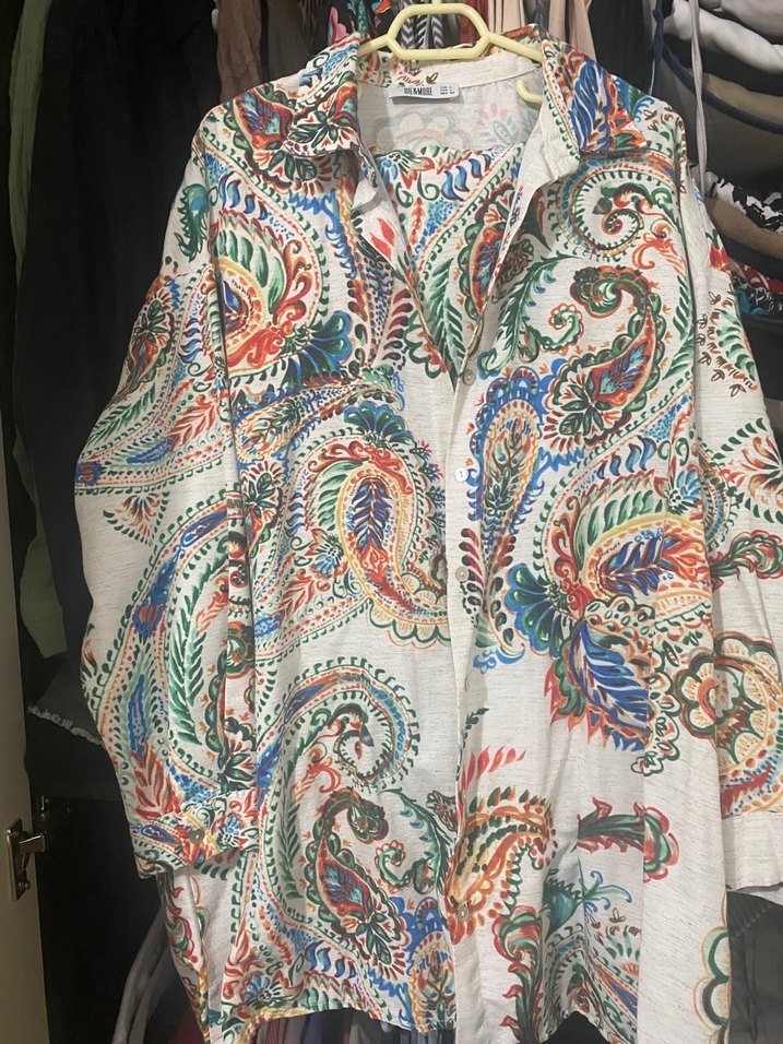 Bohem tarzda, çok renkli desenli tekstil gömlek. Salaş ve drapeli kesime, uzun kollu ve yakalıdır Pantolon beli lastikli ve ceplidir paçaları geniştir kumaşı keten görünümlüdür Boy ölçlüleri son resimlerde mevcuttur