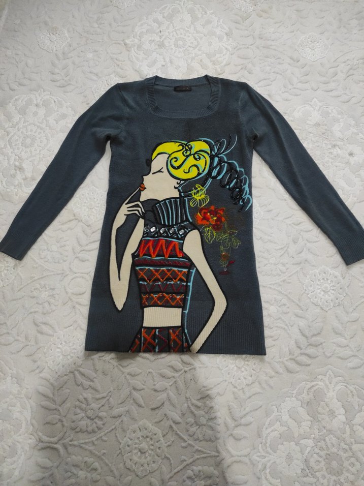 Bohem tarzda, uzun boylu ve fitted kesimli kadın kazak. Yuvarlak yaka ve baskılı desen içerir. Yumuşak sentetik kumaştan, koyu gri renkte üretilmiştir.