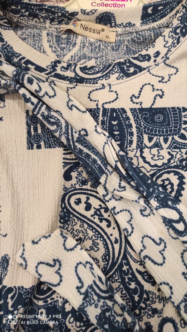 Mavi ve gri renklerde, bohem desenli, uzun kollu ve yuvarlak yakalı bol kesim hamile tunik. Günlük kullanıma uygun, dökümlü tasarıma sahip.