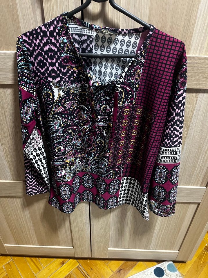 Kadınlar için bol kesim, uzun kollu, düğmeli ve yüksek yakalı bluz. Koyu renkli çoklu desenlere sahip, bohem tarzda midi uzunlukta günlük kullanıma uygun. S/M bedene uyumlu diğer ürünlerime bakmanızı tavsiye ederim