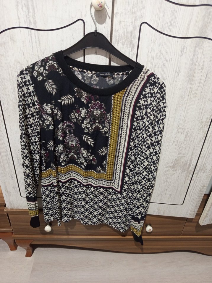 Bohem tarzı, uzun kollu ve bisiklet yaka kadın bluz. Çok desenli, dokuma kumaştan ve koyu tonlarda, günlük kullanıma uygundur.
