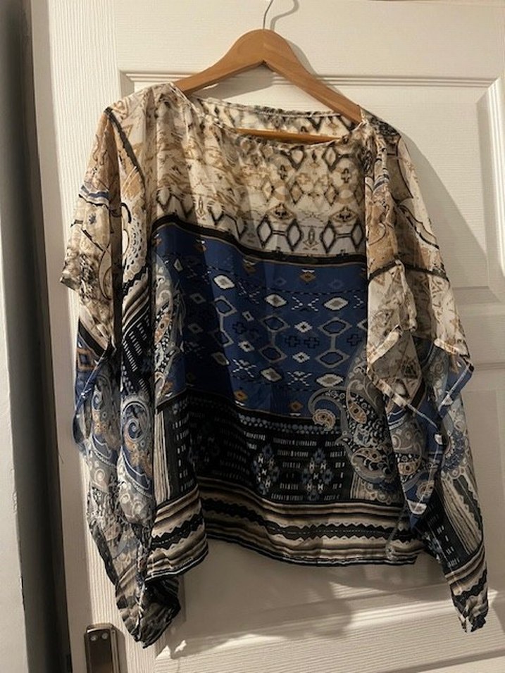 Bohem tarzda, desenli tekstil kumaştan, drapeli ve bol kesim uzun kollu kadın bluz. Tekne yaka ve midi boyda, günlük kullanıma uygun.