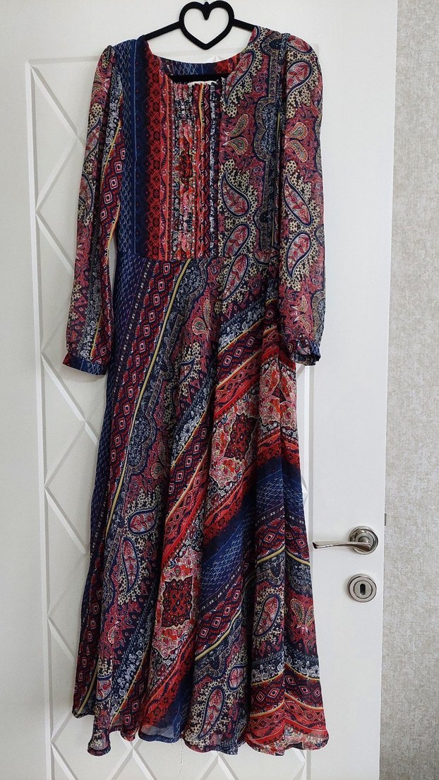 Bohem tarzda, desenli tekstil kumaştan, uzun kollu, yakası kesik ve bol kesim kadın elbisesi. Günlük kullanıma uygun, dökümlü model.