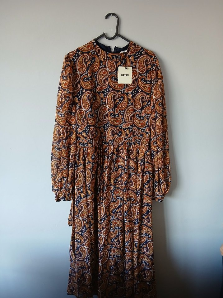 Bohem tarzı, bol kesim, uzun kollu, desenli koyu kahverengi kumaştan elbise. Yuvarlak yakalı, günlük kullanıma uygun.