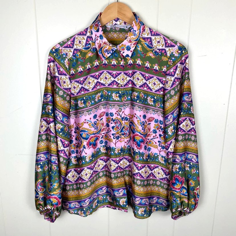 Bohem tarzında, düğmeli, yakalı, uzun kollu ve bol kesim kadın gömleği. Canlı pastel çok renkli desenli kumaştan, günlük kullanım için uygun.