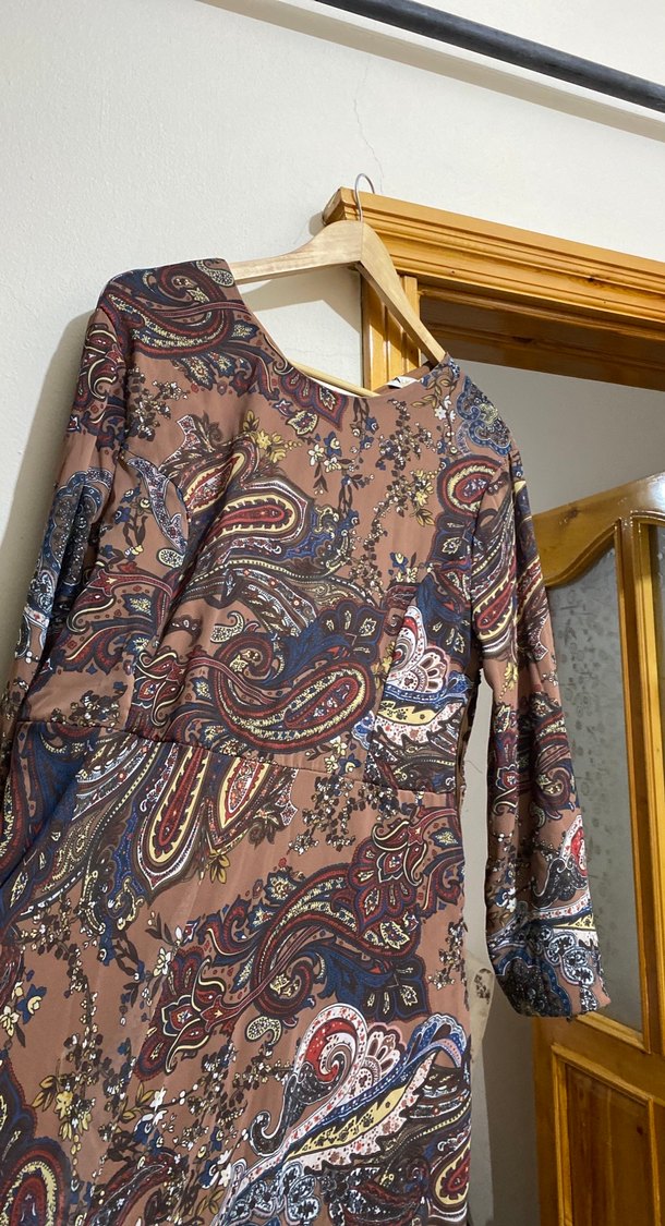 Koyu kahverengi paisley desenli, bol kesim ve drapeli uzun kollu, yuvarlak yakalı bohem tarzda uzun elbise. Günlük kullanıma uygundur.