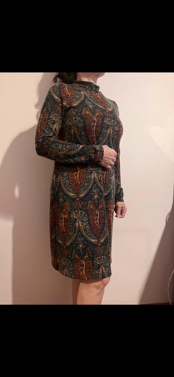 Bohem tarzı desenli, uzun kollu ve yüksek yakalı triko elbise. Kahverengi kumaştan, ofis kullanımı için uygun, vücuda oturan kesim.