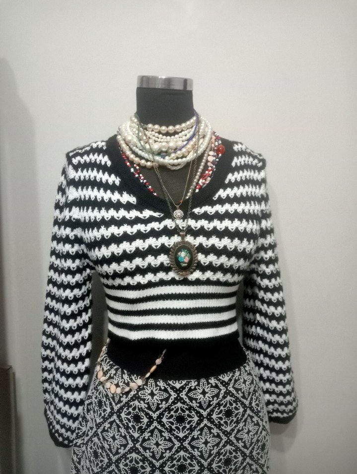 Bohem tarzında, desenli, uzun kollu, yakalı ve fitted kesim triko kazak. Siyah beyaz renklerde, günlük kullanım için uygundur.crop gibi kısadır