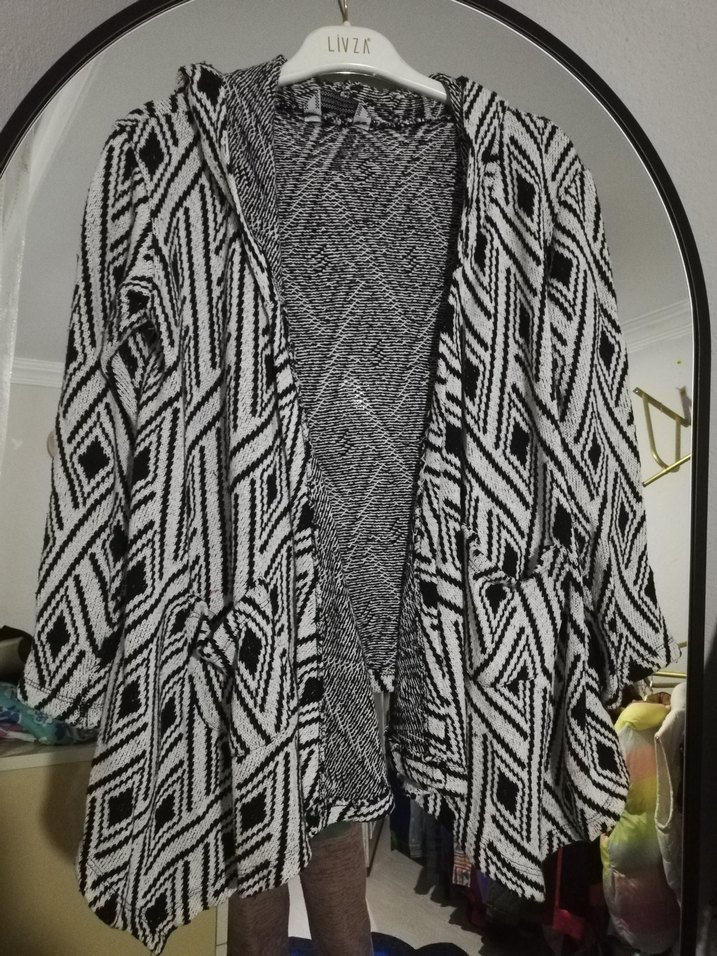 Uzun, bol kesim ve V yaka olan bu hırka, desenli örme yapısıyla bohem tarzını koyu gri tonlarda yansıtıyor.
