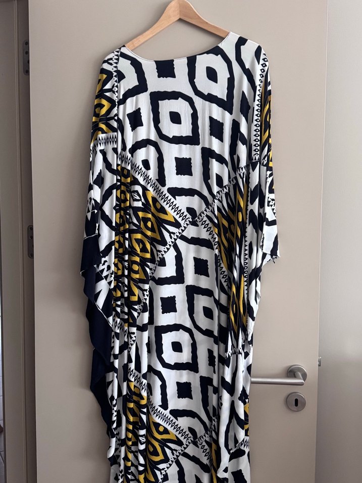 Bu uzun kadın elbisesi, salaş kesim ve drapeli tasarıma sahip olup, kayık yaka ve kısa kolludur. Çok renkli koyu desenli kumaşıyla bohem tarzı yansıtır. Yarasa koldur beden standarttır 44 e kadar gıyılır sıyah görünen yerler lacıverttir