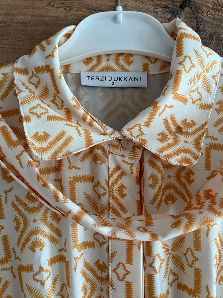 Terzi Dukkani imzalı, bohem desenli, uzun kollu, düğmeli, bol kesim elbise, tekne yakalı.