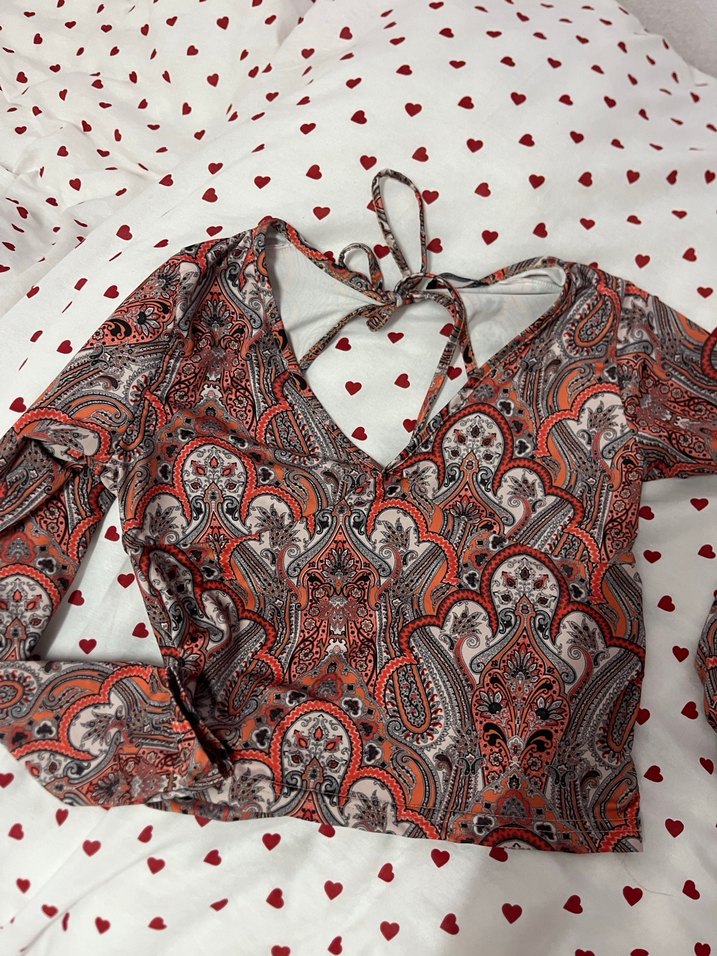 sırt dekolteli oldugu icin kullanamiyorum V yaka detaylı, bohem desenli, uzun kollu, normal boyda, yumuşak dokulu kumaştan yapılmış dar kesim bluz.